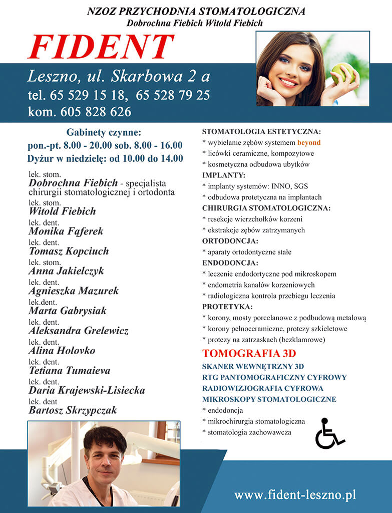 Przychodnia Stomatologiczna FIDENT jest przychodnią o statusie Niepublicznego Zakładu Opieki Zdrowotnej. Swoją działalność rozpoczęła w 1968r., a na terenie Leszna działa od 1974r.