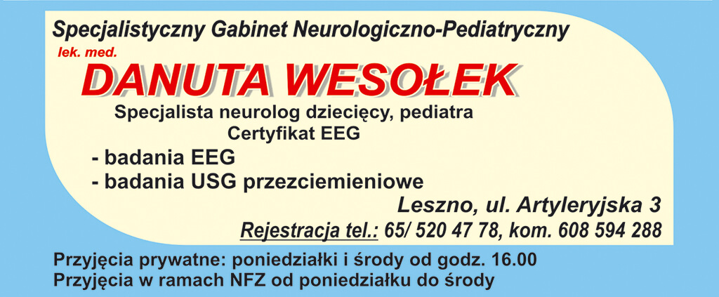 Lek. med. Danuta Wesołek jest specjalistą pediatrii i neurologii dziecięcej st. II. Posiada duże doświadczenie zawodowe (na oddziałach szpitalnych i w poradniach) w diagnostyce i leczeniu dzieci. Neurolog dziecięcy dr Wesołek zajmuje się leczeniem takich chorób i dolegliwości jak: padaczka, bóle głowy, porażenie mózgowe, ADHD, itp. Gabinet, który znajduje się przy ul. Artyleryjskiej w Lesznie, wyposażony jest w sprzęt diagnostyczny do badań: EEG głowy i USG przezciemieniowe.
